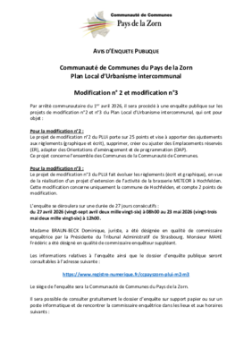 Par arrêté communautaire du 1er avril 2026, il sera procédé à une enquête publique sur les projets de modification n°2 et 3 du Plan Local d'Urbanisme intercommunal.